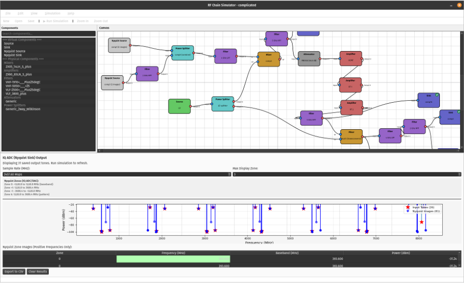 Cryogenic microwave experiments involve complex signal chains — sources, power splitters, amplifiers, mixers, filters — running through multiple temperature stages. It's easy to lose track of spurious signals, images, or to accidentally drive an amplifier into compression. Kaveh built a GUI for simulating these chains: you define the components (with support for importing S2P files from manufacturers or VNAs), and it calculates signal propagation through the chain.