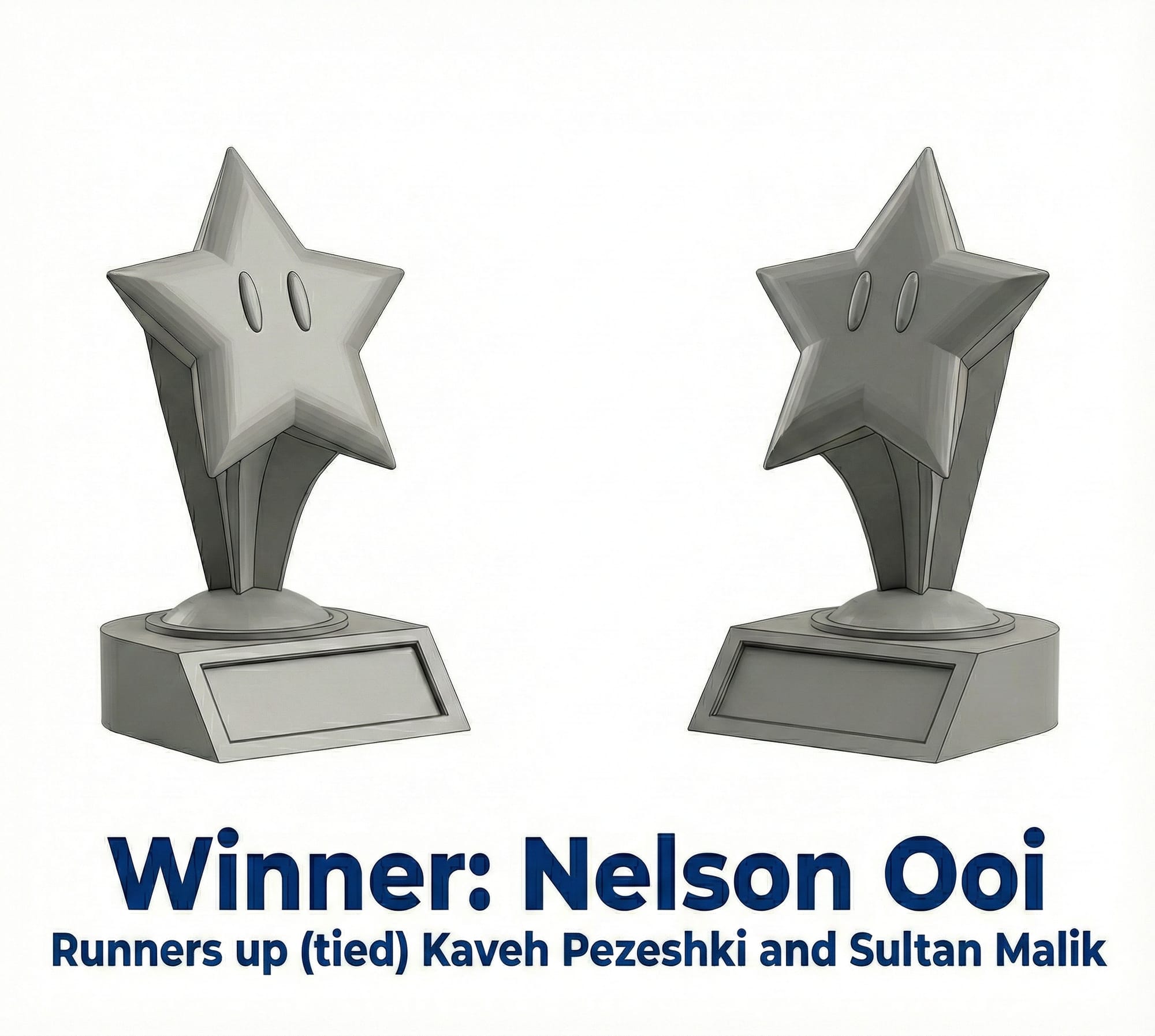 Prizes: a CNC plaque on 3d-printed trophy, eternal glory, and a shout-out from Wentao.