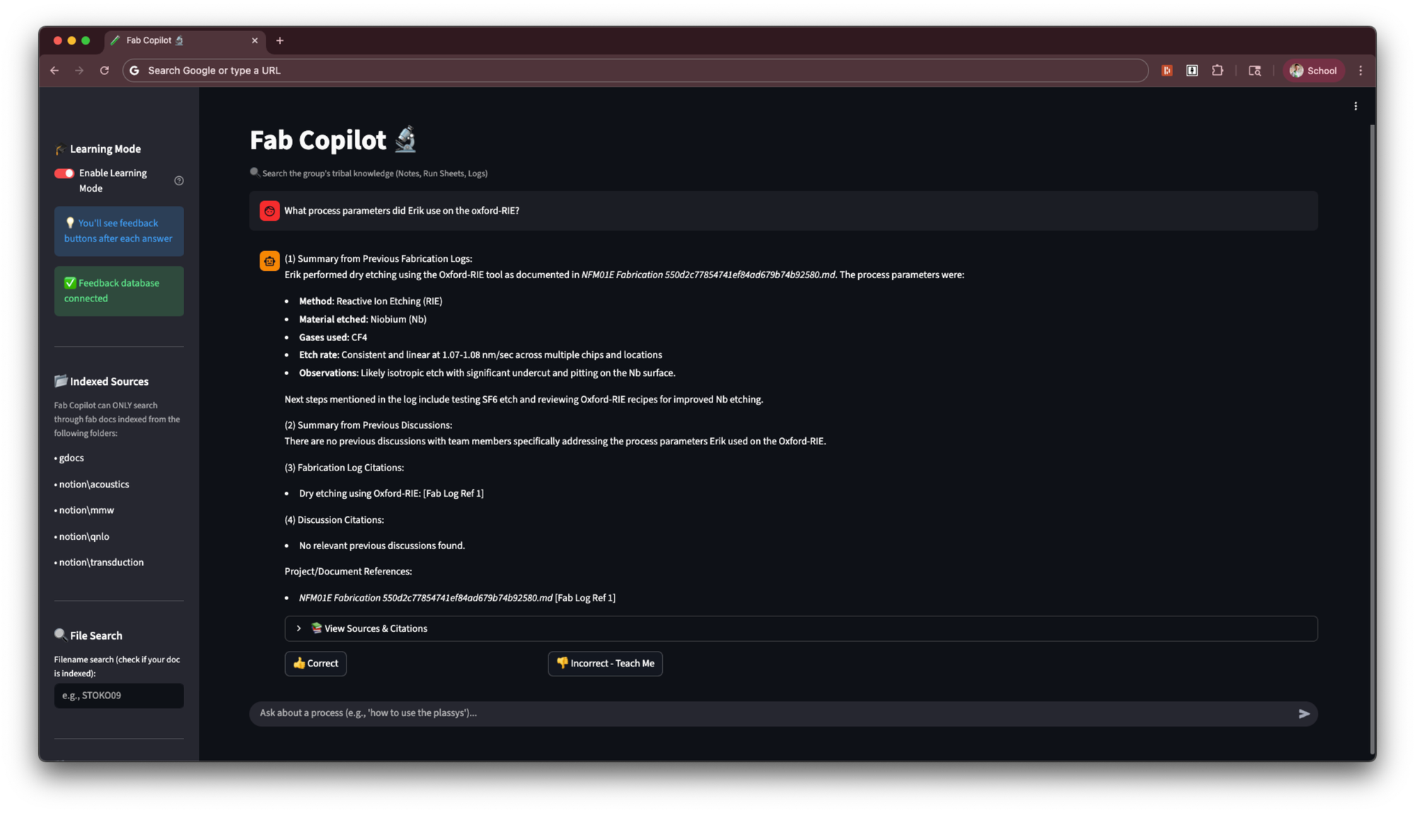 Zelong built a retrieval-augmented generation (RAG) system for searching our lab's documentation. You ask a question — "What's the SOP for the Plassys e-beam evaporator?" or "What etch recipe did we use for the last LN run?" — and it retrieves relevant document chunks, then uses an LLM to synthesize an answer with citations.