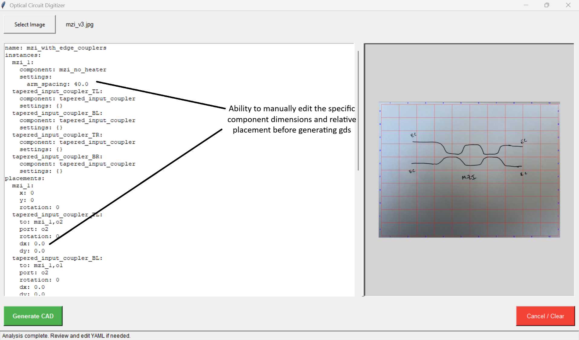 This team built a pipeline: upload a photo of a hand-drawn circuit. The app overlays a grid. Google's Gemini vision model analyzes the image and generates a structured YAML description of the circuit — components, connections, positions. The user reviews and edits the YAML, hits "Generate CAD," and GDSFactory produces a GDSII file ready for lithography.