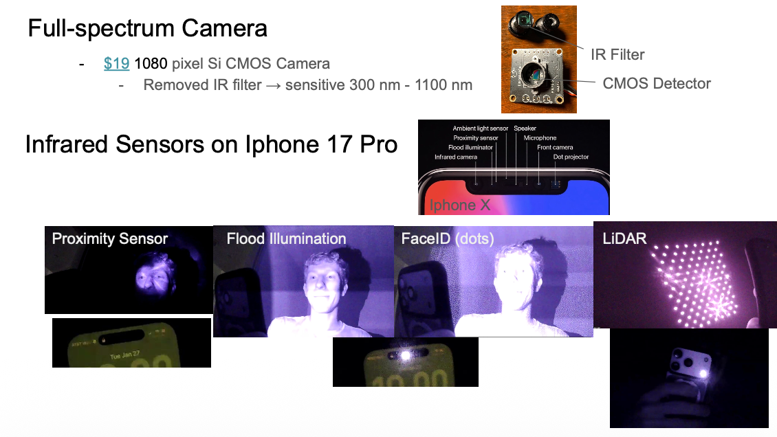 Devin explored the infrared sensors built into modern smartphones — Face ID's IR dot projector, LiDAR depth sensing, proximity sensors, flood illuminators, and thermal imaging. He documented how each sensor works through hands-on experimentation with video demonstrations and frame-by-frame analysis! 😄