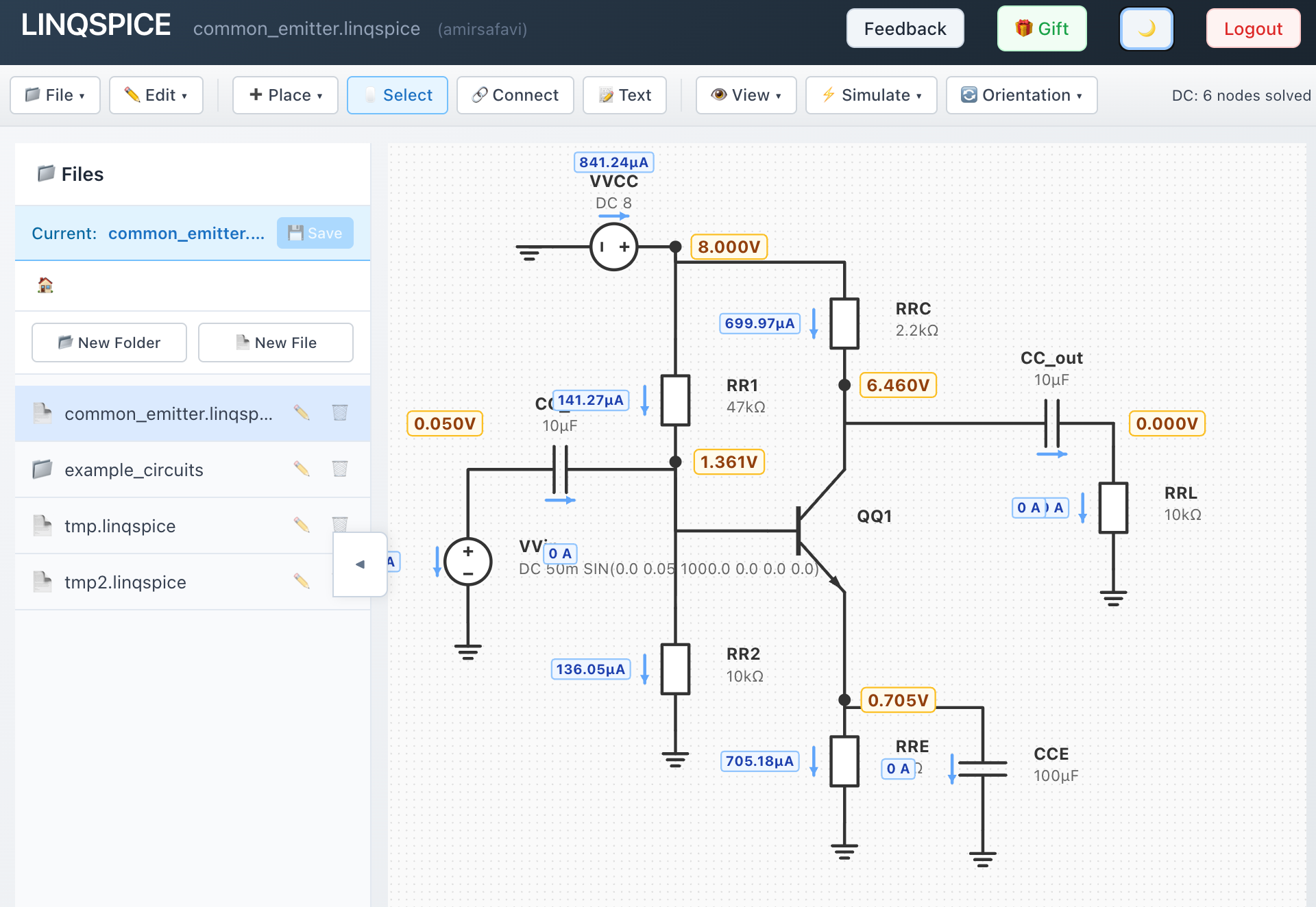 I want students in my courses to be able to open a browser tab and simulate a circuit without fighting LTSpice. No install, no account (you just need a google account to log in, so your files are kept under under your file), no license. Just open the page and start.
