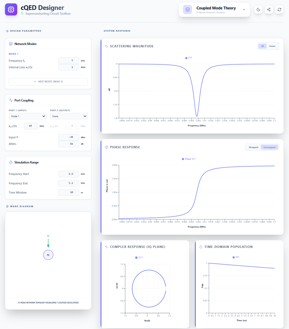 Sultan built a browser-based calculator for common circuit QED problems: single qubit-resonator systems, two qubits coupled via a tunable coupler, general coupled-mode problems, plus assorted microwave/photonics/optics calculators. It runs entirely in the browser (no backend).